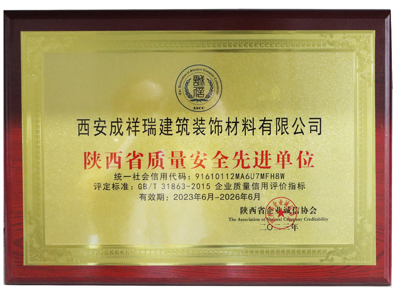 2023年6月27日,西安成祥瑞建筑装饰材料有限公司获得“陕西省质量安全先进单位” “陕西省重质量守信用企业”荣誉称号!